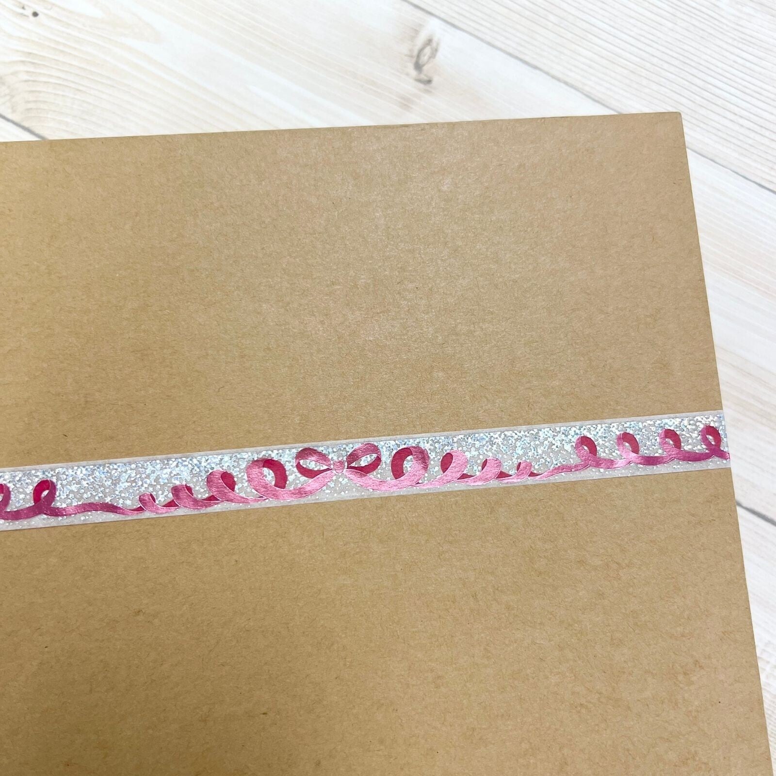 スパークリング箔とイルミナピンク箔がちりばめられた、箔がキラキラ可愛いリボンデザインのマスキングテープです。